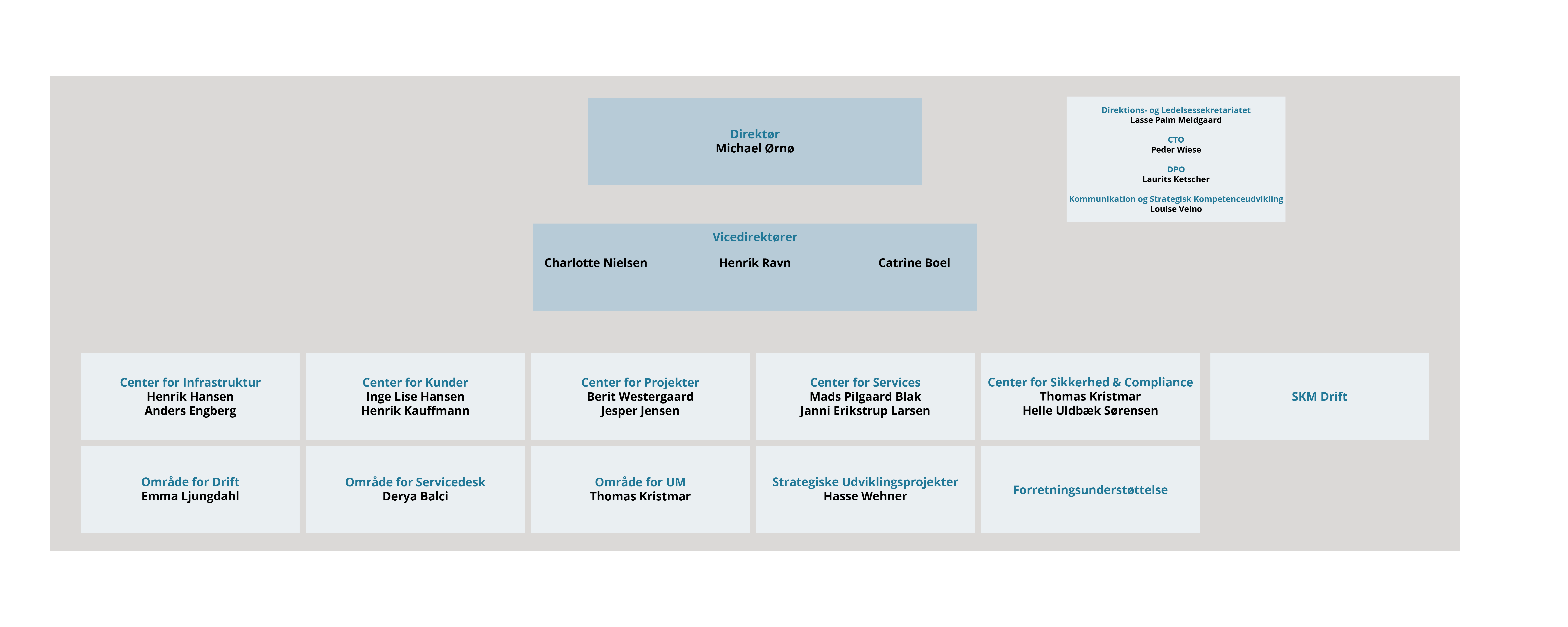 Medarbejderne i Statens It er fordelt på en direktion og 10 centre og områder. Ledelsen i Statens It består således af en direktion, en chefgruppe og en række teamledere under hvert center og område. I nedenstående diagram kan du få et overblik over organisationens centre.